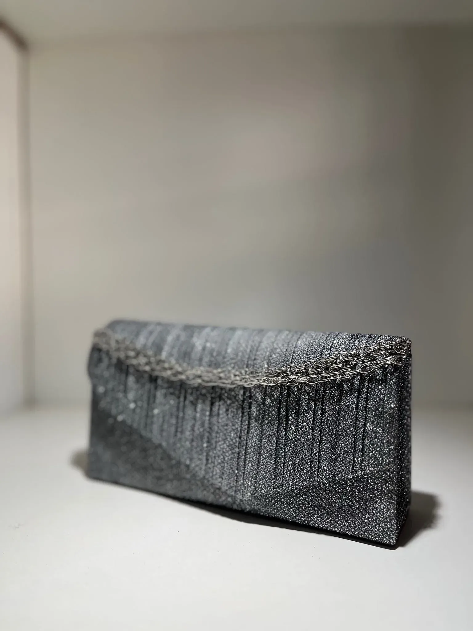Cartera plateada con brillos, ideal para agregar un toque de glamour a tu look. Con un diseño elegante y sofisticado, esta cartera es perfecta para ocasiones especiales o para darle un toque de brillo a tu outfit diario. ¡Destaca con estilo con esta cartera brillante!