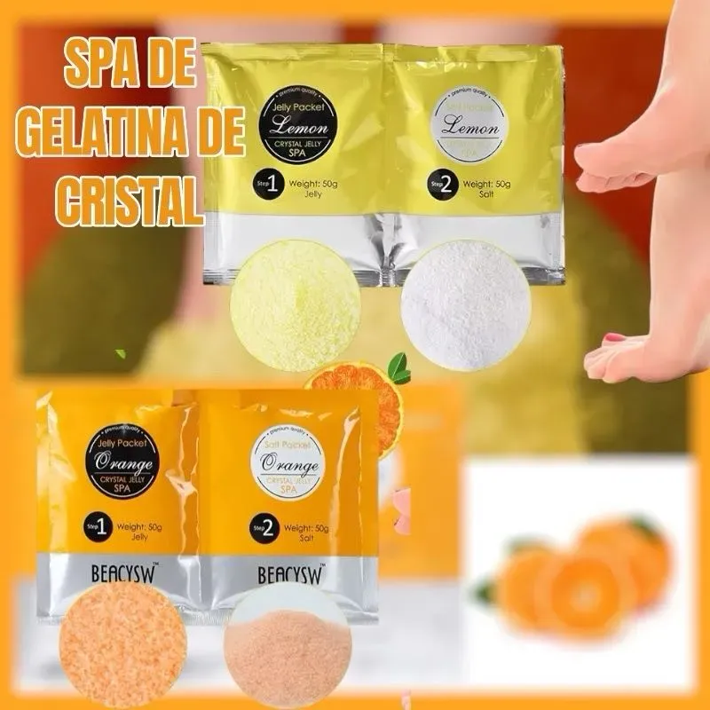 El paquete del paso 1 contiene cristales de gelatina que se añaden al agua tibia para crear una consistencia gelatinosa, lo que ayuda a desintoxicar, hidratar y suavizar la piel.